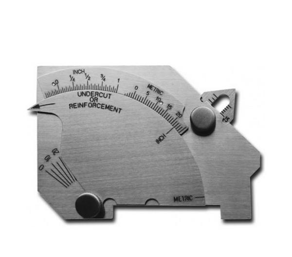 предназначен для измерений вогнутости углового шва, выпуклости шва, катета углового шва, глубины подреза, смещения, глубины точечной коррозии, а также для использования в качестве линейки до 60 мм и измерения угла разделки кромок 0° — 60°. Измеритель Bridge Cam изготовлен из нержавеющей стали состоит из базовой пластины с 3-мя шкалами, ползунка с 1-й шкалой и подвижного указателя с риской.